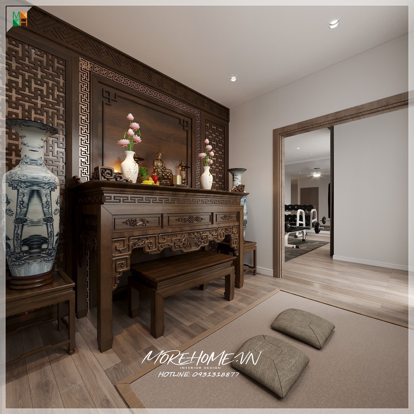 Mẫu thiết kế đơn giản, nhẹ nhàng nhưng thể hiện được rõ không khí trang nghiêm sùng kính của không gian tâm linh đồng thời mang tới sự hài hòa của phòng thờ